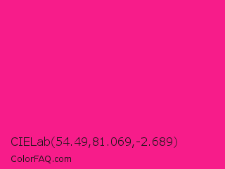CIELab 54.49,81.069,-2.689 Color is a normal rose color and the nearest color is Fluorescent Pink #ff1493. Hex code #f71c8a and RGB value is rgb(247,28,138). In RGB color space, this color is composed of 97% red, 11% green, 54% blue, In CMYK color space, this color is composed of 0% cyan, 89% magenta, 44% yellow , 3% black , In HSL color space, this color has a hue angle of 330° , 93% saturation and 54% lightness.