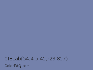 CIELab 54.4,5.41,-23.817 Color is a normal blue color and the nearest color is Shadow Blue #778ba5. Hex code #7481ab and RGB value is rgb(116,129,171). In RGB color space, this color is composed of 45% red, 51% green, 67% blue, In CMYK color space, this color is composed of 32% cyan, 25% magenta, 0% yellow , 33% black , In HSL color space, this color has a hue angle of 226° , 25% saturation and 56% lightness.