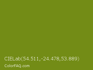 CIELab 54.511,-24.478,53.889 Color is a normal lime color and the nearest color is Trendy Green #7c881a. Hex code #738c16 and RGB value is rgb(115,140,22). In RGB color space, this color is composed of 45% red, 55% green, 9% blue, In CMYK color space, this color is composed of 18% cyan, 0% magenta, 84% yellow , 45% black , In HSL color space, this color has a hue angle of 73° , 73% saturation and 32% lightness.