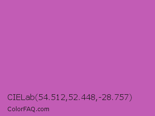 CIELab 54.512,52.448,-28.757 Color is a normal magenta color and the nearest color is Fuchsia Pink #c154c1. Hex code #c25cb5 and RGB value is rgb(194,92,181). In RGB color space, this color is composed of 76% red, 36% green, 71% blue, In CMYK color space, this color is composed of 0% cyan, 53% magenta, 7% yellow , 24% black , In HSL color space, this color has a hue angle of 308° , 46% saturation and 56% lightness.
