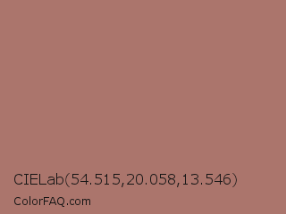 CIELab 54.515,20.058,13.546 Color is a normal red color and the nearest color is Copper Penny #ad6f69. Hex code #ab756c and RGB value is rgb(171,117,108). In RGB color space, this color is composed of 67% red, 46% green, 42% blue, In CMYK color space, this color is composed of 0% cyan, 32% magenta, 37% yellow , 33% black , In HSL color space, this color has a hue angle of 9° , 27% saturation and 55% lightness.