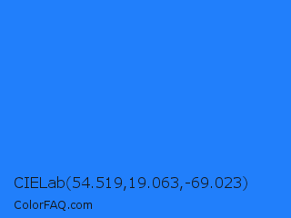 CIELab 54.519,19.063,-69.023 Color is a normal blue color and the nearest color is Blue Crayola #1f75fe. Hex code #217ffb and RGB value is rgb(33,127,251). In RGB color space, this color is composed of 13% red, 50% green, 98% blue, In CMYK color space, this color is composed of 87% cyan, 49% magenta, 0% yellow , 2% black , In HSL color space, this color has a hue angle of 214° , 96% saturation and 56% lightness.