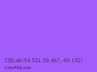 CIELab 54.521,59.467,-69.192 Color is a light violet color and the nearest color is Navy Purple #9457eb. Hex code #a35cfc and RGB value is rgb(163,92,252). In RGB color space, this color is composed of 64% red, 36% green, 99% blue, In CMYK color space, this color is composed of 35% cyan, 63% magenta, 0% yellow , 1% black , In HSL color space, this color has a hue angle of 267° , 96% saturation and 67% lightness.