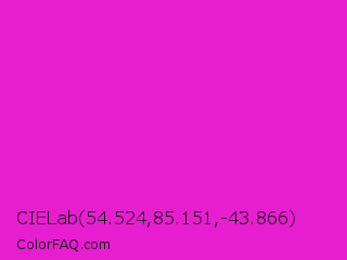 CIELab 54.524,85.151,-43.866 Color is a normal magenta color and the nearest color is Hot Magenta #ff1dce. Hex code #e71ed0 and RGB value is rgb(231,30,208). In RGB color space, this color is composed of 91% red, 12% green, 82% blue, In CMYK color space, this color is composed of 0% cyan, 87% magenta, 10% yellow , 9% black , In HSL color space, this color has a hue angle of 307° , 81% saturation and 51% lightness.