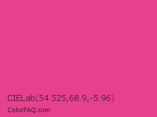 CIELab 54.525,68.9,-5.96 Color is a normal rose color and the nearest color is Cerise Pink #ec3b83. Hex code #e6408f and RGB value is rgb(230,64,143). In RGB color space, this color is composed of 90% red, 25% green, 56% blue, In CMYK color space, this color is composed of 0% cyan, 72% magenta, 38% yellow , 10% black , In HSL color space, this color has a hue angle of 331° , 77% saturation and 58% lightness.