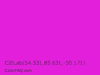 CIELab 54.531,85.631,-50.171 Color is a normal magenta color and the nearest color is Hot Magenta #ff1dce. Hex code #e320db and RGB value is rgb(227,32,219). In RGB color space, this color is composed of 89% red, 13% green, 86% blue, In CMYK color space, this color is composed of 0% cyan, 86% magenta, 4% yellow , 11% black , In HSL color space, this color has a hue angle of 302° , 78% saturation and 51% lightness.