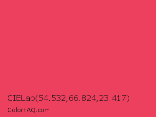 CIELab 54.532,66.824,23.417 Color is a normal red color and the nearest color is Paradise Pink #e63e62. Hex code #ed405e and RGB value is rgb(237,64,94). In RGB color space, this color is composed of 93% red, 25% green, 37% blue, In CMYK color space, this color is composed of 0% cyan, 73% magenta, 60% yellow , 7% black , In HSL color space, this color has a hue angle of 350° , 83% saturation and 59% lightness.