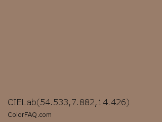 CIELab 54.533,7.882,14.426 Color is a normal orange color and the nearest color is Beaver #9f8170. Hex code #997d6a and RGB value is rgb(153,125,106). In RGB color space, this color is composed of 60% red, 49% green, 42% blue, In CMYK color space, this color is composed of 0% cyan, 18% magenta, 31% yellow , 40% black , In HSL color space, this color has a hue angle of 24° , 19% saturation and 51% lightness.