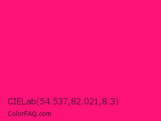 CIELab 54.537,82.021,8.3 Color is a normal rose color and the nearest color is Winter Sky #ff007c. Hex code #fc1278 and RGB value is rgb(252,18,120). In RGB color space, this color is composed of 99% red, 7% green, 47% blue, In CMYK color space, this color is composed of 0% cyan, 93% magenta, 52% yellow , 1% black , In HSL color space, this color has a hue angle of 334° , 98% saturation and 53% lightness.