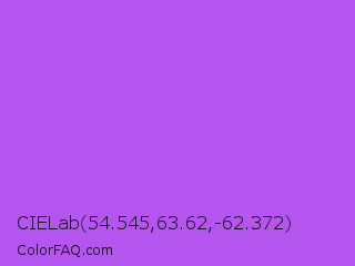 CIELab 54.545,63.62,-62.372 Color is a light purple color and the nearest color is Medium Orchid #ba55d3. Hex code #b455f0 and RGB value is rgb(180,85,240). In RGB color space, this color is composed of 71% red, 33% green, 94% blue, In CMYK color space, this color is composed of 25% cyan, 65% magenta, 0% yellow , 6% black , In HSL color space, this color has a hue angle of 277° , 84% saturation and 64% lightness.