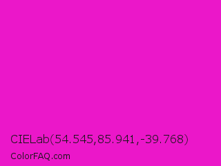 CIELab 54.545,85.941,-39.768 Color is a normal magenta color and the nearest color is Shocking Pink #fc0fc0. Hex code #eb17c9 and RGB value is rgb(235,23,201). In RGB color space, this color is composed of 92% red, 9% green, 79% blue, In CMYK color space, this color is composed of 0% cyan, 90% magenta, 14% yellow , 8% black , In HSL color space, this color has a hue angle of 310° , 84% saturation and 51% lightness.