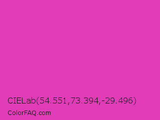 CIELab 54.551,73.394,-29.496 Color is a normal magenta color and the nearest color is Frostbite #e936a7. Hex code #e03cb7 and RGB value is rgb(224,60,183). In RGB color space, this color is composed of 88% red, 24% green, 72% blue, In CMYK color space, this color is composed of 0% cyan, 73% magenta, 18% yellow , 12% black , In HSL color space, this color has a hue angle of 315° , 73% saturation and 56% lightness.