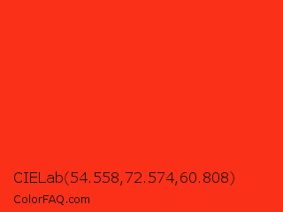 CIELab 54.558,72.574,60.808 Color is a normal red color and the nearest color is Red RYB #fe2712. Hex code #fa3018 and RGB value is rgb(250,48,24). In RGB color space, this color is composed of 98% red, 19% green, 9% blue, In CMYK color space, this color is composed of 0% cyan, 81% magenta, 90% yellow , 2% black , In HSL color space, this color has a hue angle of 6° , 96% saturation and 54% lightness.