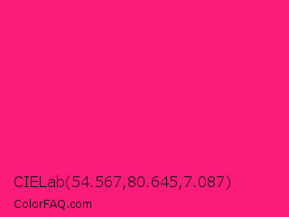 CIELab 54.567,80.645,7.087 Color is a normal rose color and the nearest color is Fluorescent Pink #ff1493. Hex code #fa1b7a and RGB value is rgb(250,27,122). In RGB color space, this color is composed of 98% red, 11% green, 48% blue, In CMYK color space, this color is composed of 0% cyan, 89% magenta, 51% yellow , 2% black , In HSL color space, this color has a hue angle of 334° , 96% saturation and 54% lightness.