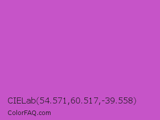CIELab 54.571,60.517,-39.558 Color is a normal magenta color and the nearest color is Fuchsia Pink #c154c1. Hex code #c654c8 and RGB value is rgb(198,84,200). In RGB color space, this color is composed of 78% red, 33% green, 78% blue, In CMYK color space, this color is composed of 1% cyan, 58% magenta, 0% yellow , 22% black , In HSL color space, this color has a hue angle of 299° , 51% saturation and 56% lightness.
