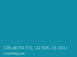 CIELab 54.572,-22.826,-21.001 Color is a normal cyan color and the nearest color is Blue Munsell #0093af. Hex code #118fa6 and RGB value is rgb(17,143,166). In RGB color space, this color is composed of 7% red, 56% green, 65% blue, In CMYK color space, this color is composed of 90% cyan, 14% magenta, 0% yellow , 35% black , In HSL color space, this color has a hue angle of 189° , 81% saturation and 36% lightness.