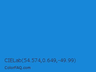 CIELab 54.574,0.649,-49.99 Color is a normal blue color and the nearest color is Bright Navy Blue #1974d2. Hex code #1787d9 and RGB value is rgb(23,135,217). In RGB color space, this color is composed of 9% red, 53% green, 85% blue, In CMYK color space, this color is composed of 89% cyan, 38% magenta, 0% yellow , 15% black , In HSL color space, this color has a hue angle of 205° , 81% saturation and 47% lightness.