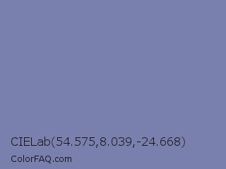 CIELab 54.575,8.039,-24.668 Color is a normal blue color and the nearest color is Shadow Blue #778ba5. Hex code #7980ad and RGB value is rgb(121,128,173). In RGB color space, this color is composed of 47% red, 50% green, 68% blue, In CMYK color space, this color is composed of 30% cyan, 26% magenta, 0% yellow , 32% black , In HSL color space, this color has a hue angle of 232° , 24% saturation and 58% lightness.