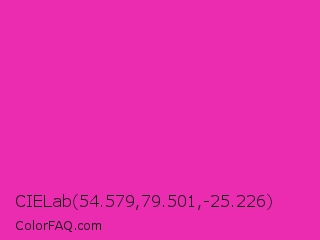 CIELab 54.579,79.501,-25.226 Color is a normal magenta color and the nearest color is Frostbite #e936a7. Hex code #eb2bb0 and RGB value is rgb(235,43,176). In RGB color space, this color is composed of 92% red, 17% green, 69% blue, In CMYK color space, this color is composed of 0% cyan, 82% magenta, 25% yellow , 8% black , In HSL color space, this color has a hue angle of 318° , 83% saturation and 55% lightness.