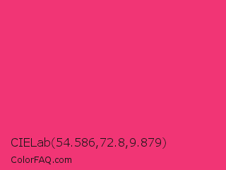 CIELab 54.586,72.8,9.879 Color is a normal rose color and the nearest color is Cerise Pink #ec3b83. Hex code #f13575 and RGB value is rgb(241,53,117). In RGB color space, this color is composed of 95% red, 21% green, 46% blue, In CMYK color space, this color is composed of 0% cyan, 78% magenta, 51% yellow , 5% black , In HSL color space, this color has a hue angle of 340° , 87% saturation and 58% lightness.