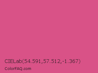 CIELab 54.591,57.512,-1.367 Color is a normal rose color and the nearest color is Fandango Pink #de5285. Hex code #d95287 and RGB value is rgb(217,82,135). In RGB color space, this color is composed of 85% red, 32% green, 53% blue, In CMYK color space, this color is composed of 0% cyan, 62% magenta, 38% yellow , 15% black , In HSL color space, this color has a hue angle of 336° , 64% saturation and 59% lightness.