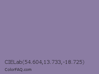 CIELab 54.604,13.733,-18.725 Color is a normal violet color and the nearest color is Mamba #8e8190. Hex code #8b7ca3 and RGB value is rgb(139,124,163). In RGB color space, this color is composed of 55% red, 49% green, 64% blue, In CMYK color space, this color is composed of 15% cyan, 24% magenta, 0% yellow , 36% black , In HSL color space, this color has a hue angle of 263° , 17% saturation and 56% lightness.
