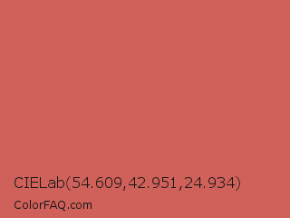CIELab 54.609,42.951,24.934 Color is a normal red color and the nearest color is Chestnut Rose #cd5c5c. Hex code #cf615a and RGB value is rgb(207,97,90). In RGB color space, this color is composed of 81% red, 38% green, 35% blue, In CMYK color space, this color is composed of 0% cyan, 53% magenta, 57% yellow , 19% black , In HSL color space, this color has a hue angle of 4° , 55% saturation and 58% lightness.