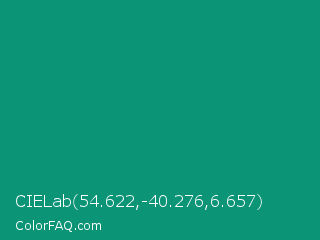 CIELab 54.622,-40.276,6.657 Color is a normal cyan color and the nearest color is Gossamer #069b81. Hex code #0c9476 and RGB value is rgb(12,148,118). In RGB color space, this color is composed of 5% red, 58% green, 46% blue, In CMYK color space, this color is composed of 92% cyan, 0% magenta, 20% yellow , 42% black , In HSL color space, this color has a hue angle of 167° , 85% saturation and 31% lightness.