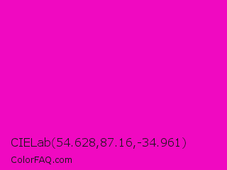 CIELab 54.628,87.16,-34.961 Color is a normal magenta color and the nearest color is Shocking Pink #fc0fc0. Hex code #f009c1 and RGB value is rgb(240,9,193). In RGB color space, this color is composed of 94% red, 4% green, 76% blue, In CMYK color space, this color is composed of 0% cyan, 96% magenta, 20% yellow , 6% black , In HSL color space, this color has a hue angle of 312° , 93% saturation and 49% lightness.