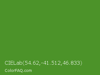 CIELab 54.62,-41.512,46.833 Color is a normal green color and the nearest color is Vida Loca #549019. Hex code #4c9329 and RGB value is rgb(76,147,41). In RGB color space, this color is composed of 30% red, 58% green, 16% blue, In CMYK color space, this color is composed of 48% cyan, 0% magenta, 72% yellow , 42% black , In HSL color space, this color has a hue angle of 100° , 56% saturation and 37% lightness.