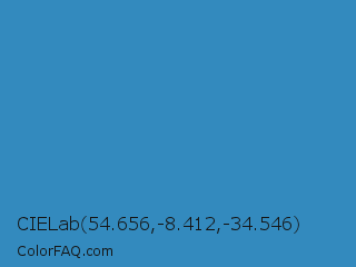 CIELab 54.656,-8.412,-34.546 Color is a normal blue color and the nearest color is Boston Blue #3b91b4. Hex code #338abe and RGB value is rgb(51,138,190). In RGB color space, this color is composed of 20% red, 54% green, 75% blue, In CMYK color space, this color is composed of 73% cyan, 27% magenta, 0% yellow , 25% black , In HSL color space, this color has a hue angle of 202° , 58% saturation and 47% lightness.