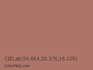 CIELab 54.664,20.376,16.109 Color is a normal red color and the nearest color is Copper Penny #ad6f69. Hex code #ad7568 and RGB value is rgb(173,117,104). In RGB color space, this color is composed of 68% red, 46% green, 41% blue, In CMYK color space, this color is composed of 0% cyan, 32% magenta, 40% yellow , 32% black , In HSL color space, this color has a hue angle of 11° , 30% saturation and 54% lightness.