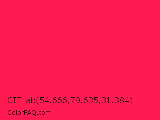 CIELab 54.666,79.635,31.384 Color is a normal red color and the nearest color is Awesome #ff2052. Hex code #ff1a52 and RGB value is rgb(255,26,82). In RGB color space, this color is composed of 100% red, 10% green, 32% blue, In CMYK color space, this color is composed of 0% cyan, 90% magenta, 68% yellow , 0% black , In HSL color space, this color has a hue angle of 345° , 100% saturation and 55% lightness.