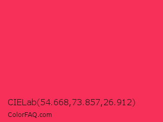 CIELab 54.668,73.857,26.912 Color is a normal red color and the nearest color is Radical Red #ff355e. Hex code #f73059 and RGB value is rgb(247,48,89). In RGB color space, this color is composed of 97% red, 19% green, 35% blue, In CMYK color space, this color is composed of 0% cyan, 81% magenta, 64% yellow , 3% black , In HSL color space, this color has a hue angle of 348° , 93% saturation and 58% lightness.