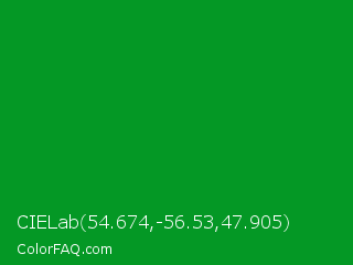 CIELab 54.674,-56.53,47.905 Color is a normal green color and the nearest color is North Texas Green #059033. Hex code #049825 and RGB value is rgb(4,152,37). In RGB color space, this color is composed of 2% red, 60% green, 15% blue, In CMYK color space, this color is composed of 97% cyan, 0% magenta, 76% yellow , 40% black , In HSL color space, this color has a hue angle of 133° , 95% saturation and 31% lightness.