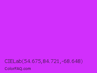 CIELab 54.675,84.721,-68.648 Color is a normal purple color and the nearest color is Vivid Orchid #cc00ff. Hex code #d12ffc and RGB value is rgb(209,47,252). In RGB color space, this color is composed of 82% red, 18% green, 99% blue, In CMYK color space, this color is composed of 17% cyan, 81% magenta, 0% yellow , 1% black , In HSL color space, this color has a hue angle of 287° , 97% saturation and 59% lightness.