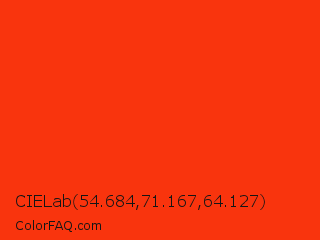 CIELab 54.684,71.167,64.127 Color is a normal red color and the nearest color is Red RYB #fe2712. Hex code #f9340d and RGB value is rgb(249,52,13). In RGB color space, this color is composed of 98% red, 20% green, 5% blue, In CMYK color space, this color is composed of 0% cyan, 79% magenta, 95% yellow , 2% black , In HSL color space, this color has a hue angle of 10° , 95% saturation and 51% lightness.