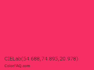 CIELab 54.688,74.895,20.978 Color is a normal rose color and the nearest color is Radical Red #ff355e. Hex code #f72e63 and RGB value is rgb(247,46,99). In RGB color space, this color is composed of 97% red, 18% green, 39% blue, In CMYK color space, this color is composed of 0% cyan, 81% magenta, 60% yellow , 3% black , In HSL color space, this color has a hue angle of 344° , 93% saturation and 57% lightness.