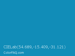CIELab 54.689,-15.409,-31.121 Color is a normal blue color and the nearest color is Blue Green #0d98ba. Hex code #118db8 and RGB value is rgb(17,141,184). In RGB color space, this color is composed of 7% red, 55% green, 72% blue, In CMYK color space, this color is composed of 91% cyan, 23% magenta, 0% yellow , 28% black , In HSL color space, this color has a hue angle of 195° , 83% saturation and 39% lightness.