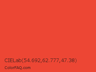 CIELab 54.692,62.777,47.38 Color is a normal red color and the nearest color is Cinnabar #e34234. Hex code #ed4634 and RGB value is rgb(237,70,52). In RGB color space, this color is composed of 93% red, 27% green, 20% blue, In CMYK color space, this color is composed of 0% cyan, 70% magenta, 78% yellow , 7% black , In HSL color space, this color has a hue angle of 6° , 84% saturation and 57% lightness.