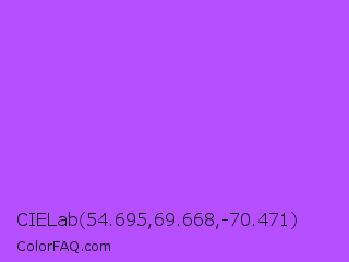 CIELab 54.695,69.668,-70.471 Color is a light purple color and the nearest color is Navy Purple #9457eb. Hex code #b54fff and RGB value is rgb(181,79,255). In RGB color space, this color is composed of 71% red, 31% green, 100% blue, In CMYK color space, this color is composed of 29% cyan, 69% magenta, 0% yellow , 0% black , In HSL color space, this color has a hue angle of 275° , 100% saturation and 65% lightness.