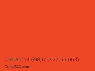 CIELab 54.698,61.977,55.063 Color is a normal red color and the nearest color is Pomegranate #f34723. Hex code #ed4724 and RGB value is rgb(237,71,36). In RGB color space, this color is composed of 93% red, 28% green, 14% blue, In CMYK color space, this color is composed of 0% cyan, 70% magenta, 85% yellow , 7% black , In HSL color space, this color has a hue angle of 10° , 85% saturation and 54% lightness.