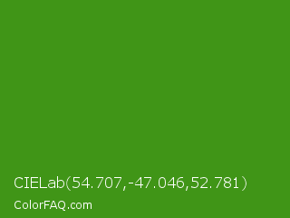 CIELab 54.707,-47.046,52.781 Color is a normal green color and the nearest color is La Palma #368716. Hex code #409517 and RGB value is rgb(64,149,23). In RGB color space, this color is composed of 25% red, 58% green, 9% blue, In CMYK color space, this color is composed of 57% cyan, 0% magenta, 85% yellow , 42% black , In HSL color space, this color has a hue angle of 100° , 73% saturation and 34% lightness.