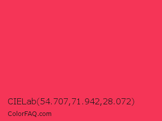 CIELab 54.707,71.942,28.072 Color is a normal red color and the nearest color is Sizzling Red #ff3855. Hex code #f53557 and RGB value is rgb(245,53,87). In RGB color space, this color is composed of 96% red, 21% green, 34% blue, In CMYK color space, this color is composed of 0% cyan, 78% magenta, 64% yellow , 4% black , In HSL color space, this color has a hue angle of 349° , 91% saturation and 58% lightness.