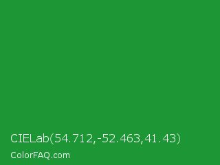 CIELab 54.712,-52.463,41.43 Color is a normal green color and the nearest color is Forest Green #228b22. Hex code #1d9735 and RGB value is rgb(29,151,53). In RGB color space, this color is composed of 11% red, 59% green, 21% blue, In CMYK color space, this color is composed of 81% cyan, 0% magenta, 65% yellow , 41% black , In HSL color space, this color has a hue angle of 132° , 68% saturation and 35% lightness.