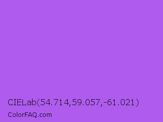 CIELab 54.714,59.057,-61.021 Color is a light purple color and the nearest color is Navy Purple #9457eb. Hex code #ae5bee and RGB value is rgb(174,91,238). In RGB color space, this color is composed of 68% red, 36% green, 93% blue, In CMYK color space, this color is composed of 27% cyan, 62% magenta, 0% yellow , 7% black , In HSL color space, this color has a hue angle of 274° , 81% saturation and 65% lightness.