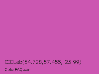 CIELab 54.728,57.455,-25.99 Color is a normal magenta color and the nearest color is Fuchsia Pink #c154c1. Hex code #cc56b1 and RGB value is rgb(204,86,177). In RGB color space, this color is composed of 80% red, 34% green, 69% blue, In CMYK color space, this color is composed of 0% cyan, 58% magenta, 13% yellow , 20% black , In HSL color space, this color has a hue angle of 314° , 54% saturation and 57% lightness.