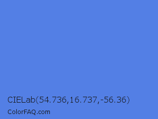 CIELab 54.736,16.737,-56.36 Color is a light blue color and the nearest color is Blueberry #4f86f7. Hex code #537fe5 and RGB value is rgb(83,127,229). In RGB color space, this color is composed of 33% red, 50% green, 90% blue, In CMYK color space, this color is composed of 64% cyan, 45% magenta, 0% yellow , 10% black , In HSL color space, this color has a hue angle of 222° , 74% saturation and 61% lightness.