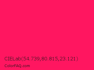 CIELab 54.739,80.815,23.121 Color is a normal rose color and the nearest color is Awesome #ff2052. Hex code #ff1660 and RGB value is rgb(255,22,96). In RGB color space, this color is composed of 100% red, 9% green, 38% blue, In CMYK color space, this color is composed of 0% cyan, 91% magenta, 62% yellow , 0% black , In HSL color space, this color has a hue angle of 341° , 100% saturation and 54% lightness.