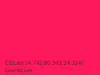 CIELab 54.742,80.593,24.324 Color is a normal rose color and the nearest color is Awesome #ff2052. Hex code #ff175e and RGB value is rgb(255,23,94). In RGB color space, this color is composed of 100% red, 9% green, 37% blue, In CMYK color space, this color is composed of 0% cyan, 91% magenta, 63% yellow , 0% black , In HSL color space, this color has a hue angle of 342° , 100% saturation and 55% lightness.